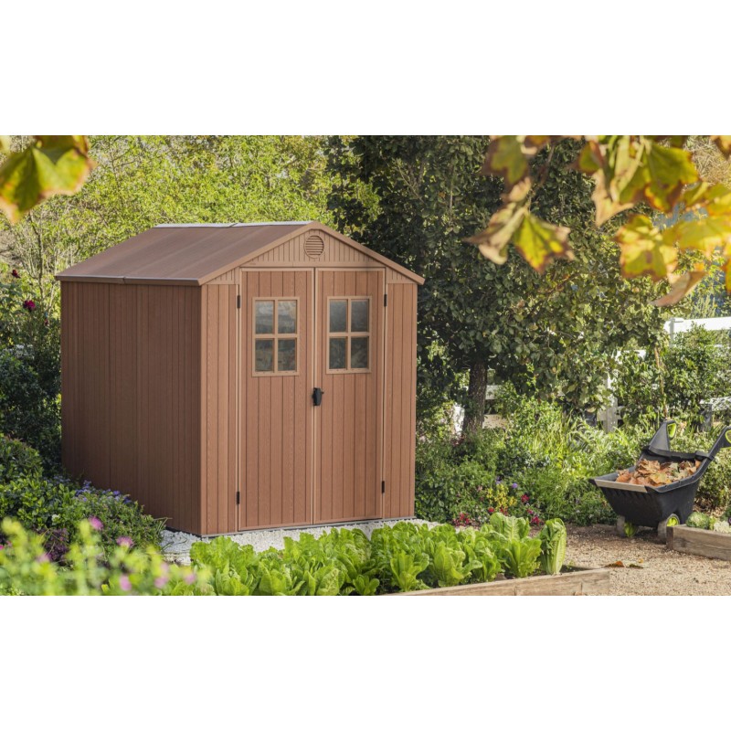 Casetta da esterno robusta e piacevole da vedere. Costruzione a doppia parete per una maggiore resistenza, prese d'aria per il flusso d'aria, lucernario per l'illuminazione interna, doppie porte per un facile accesso. Realizzato con materiale Evotech che conferisce alla casetta l'aspetto e la sensazione del legno. Non teme gli sbalzi di temperatura, è resistente ai processi di decadimento, non sbiadisce ed è altamente durevole. Fornito smontato.