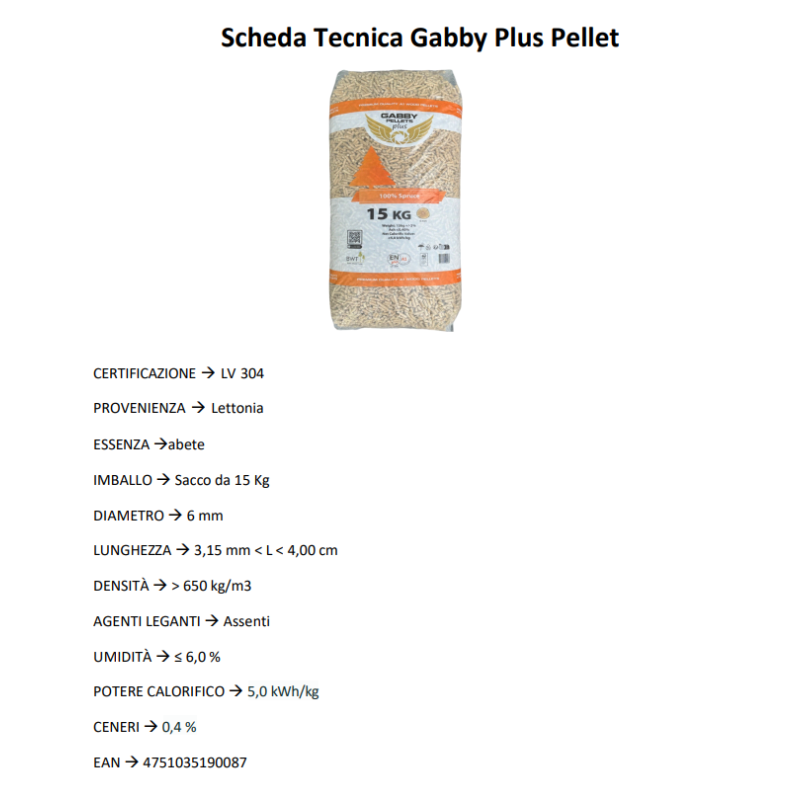 Il Gabby Pellets Plus EN Plus A1 è un pellet di legno di abete di alta qualità, progettato per garantire un riscaldamento efficiente, sostenibile e rispettoso dell’ambiente. Questo combustibile ecologico è ideale per stufe a pellet, caminetti e caldaie a caricamento automatico, offrendo prestazioni elevate e una combustione pulita.